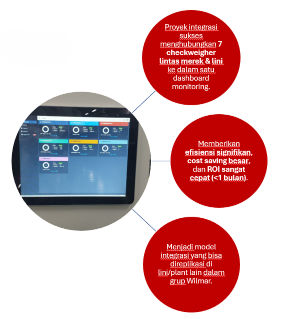 Solusi lainnya yang diberikan adalah dipasangnya PC touchscreen industrial di area produksi yang dilengkapi antarmuka intuitif, juga tahan lingkungan pabrik seperti debu, getaran, dan suhu. Satu dashboard menampilkan status tujuh checkweigher sekaligus, juga diaktifkanya dashboard monitoring dengan real-time status pada setiap line, begitupun dengan alarm deviasi sehingga terdapat notifikasi langsung untuk operator yang dapat meng-export data ke Excel/PDF untuk laporan QA dan Audit nantinya.