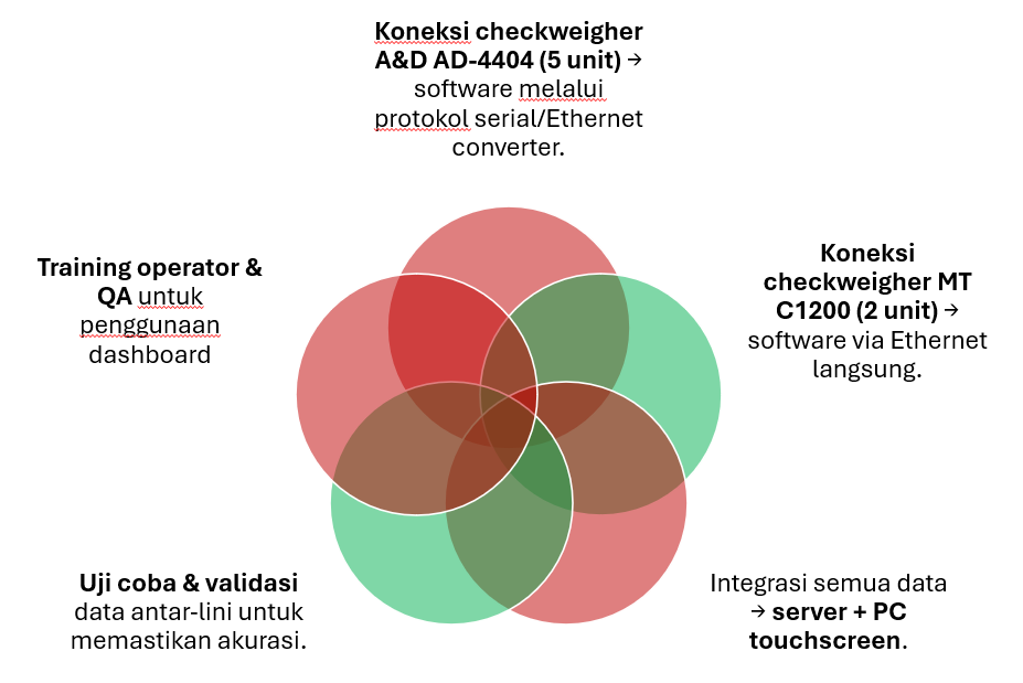 Tujuan proyek ini dilakukan untuk mengintegrasikan tujuh unit checkweigher lintas merek dan tipe ke dalam satu software monitoring. Sekaligus menyediakan dashboard realtime berbasis PC touchscreen di area produksi, juga menstandarkan format laporan otomatis harian atau mingguan sehingga memudahkan kinerja tim QA dan manajemen.