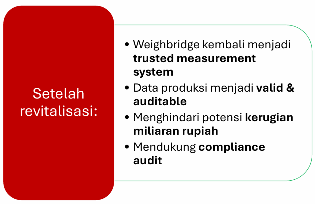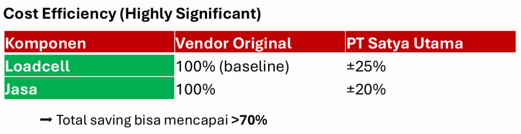 Keberhasilan ini membuktikan bahwa revitalisasi sistem weighbridge lama adalah opsi yang sangat feasible, selama dilakukan dengan pendekatan engineering yang tepat dan validasi metrologi yang benar. PT Satya Utama tidak hanya memperbaiki alat tetapi mengembalikan kepercayaan terhadap sistem pengukuran.