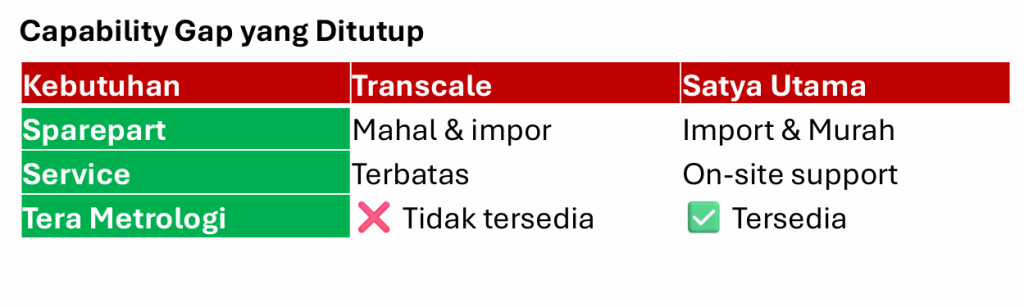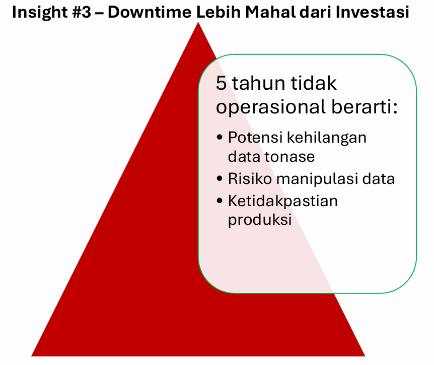 Masalah utama adalah ketergantungan pada vendor luar neger. Biaya penggantian sangat tinggi, harga loadcell Transcale ≈ 4x lebih mahal, dan biaya jasa ≈ 5x lebih mahal Tidak tersedia layanan tera metrology. Risiko operasionalnya adalah data tonase tidak valid, potensi kerugian finansial besar, seta tidak lolos audit.