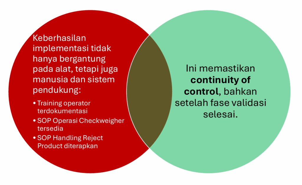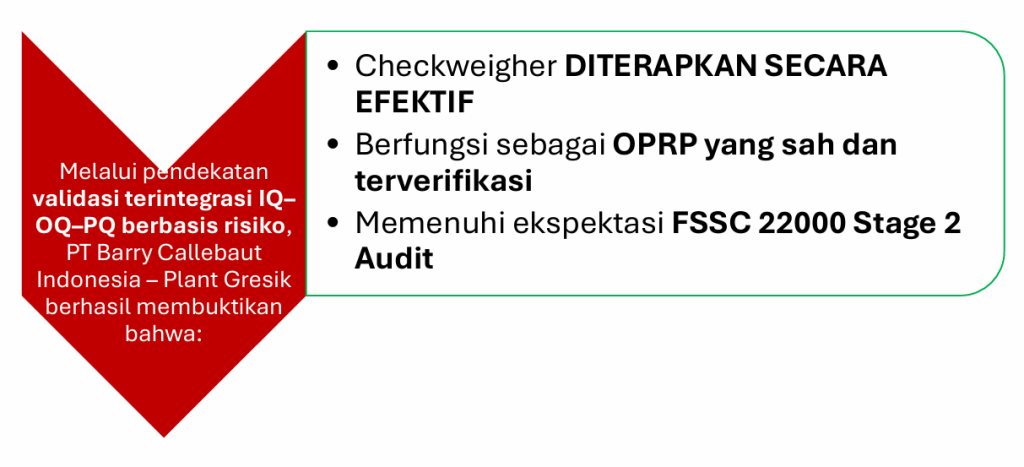 Oleh karena itu, PT Barry Callebaut menetapkan checkweigher sebagai OPRP, bukan sekadar alat inspeksi, yang menuntut akurasi terverifikasi, integrasi ke sistem HACCP (Hazard Analysis and Critical Control Points) atau sistem manajemen risiko, dan bukti objektif melalui validasi berbasis risiko.